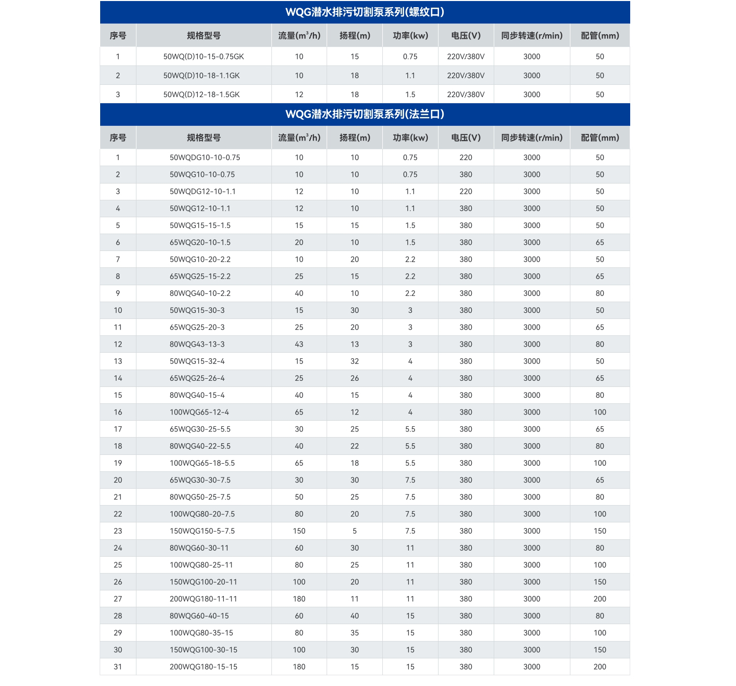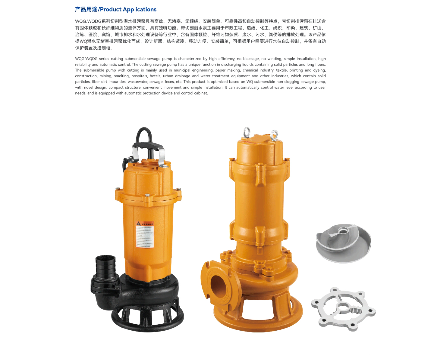 WQG/WQDG系列切割型潛水排污泵具有高效、無堵塞、無纏繞、安裝簡單、可靠性高和自動控制等特點,帶切割排污泵在排送含有固體顆粒和長纖維物質(zhì)的液體方面,具有獨特功能。帶切割潛水泵主要用于市政工程、造紙、化工、紡織、印染、建筑、礦山、冶煉、醫(yī)院、賓館、城市排水和水處理設(shè)備等行業(yè)中,含有固體顆粒、纖維污物雜質(zhì)、廢水、污水、糞便等的排放處理。該產(chǎn)品依據(jù)WQ潛水無堵塞排污泵優(yōu)化而成,設(shè)計新穎、結(jié)構(gòu)緊湊、移動方便、安裝簡單,可根據(jù)用戶需要進行水位自動控制,并備有自動保護裝置及控制柜。